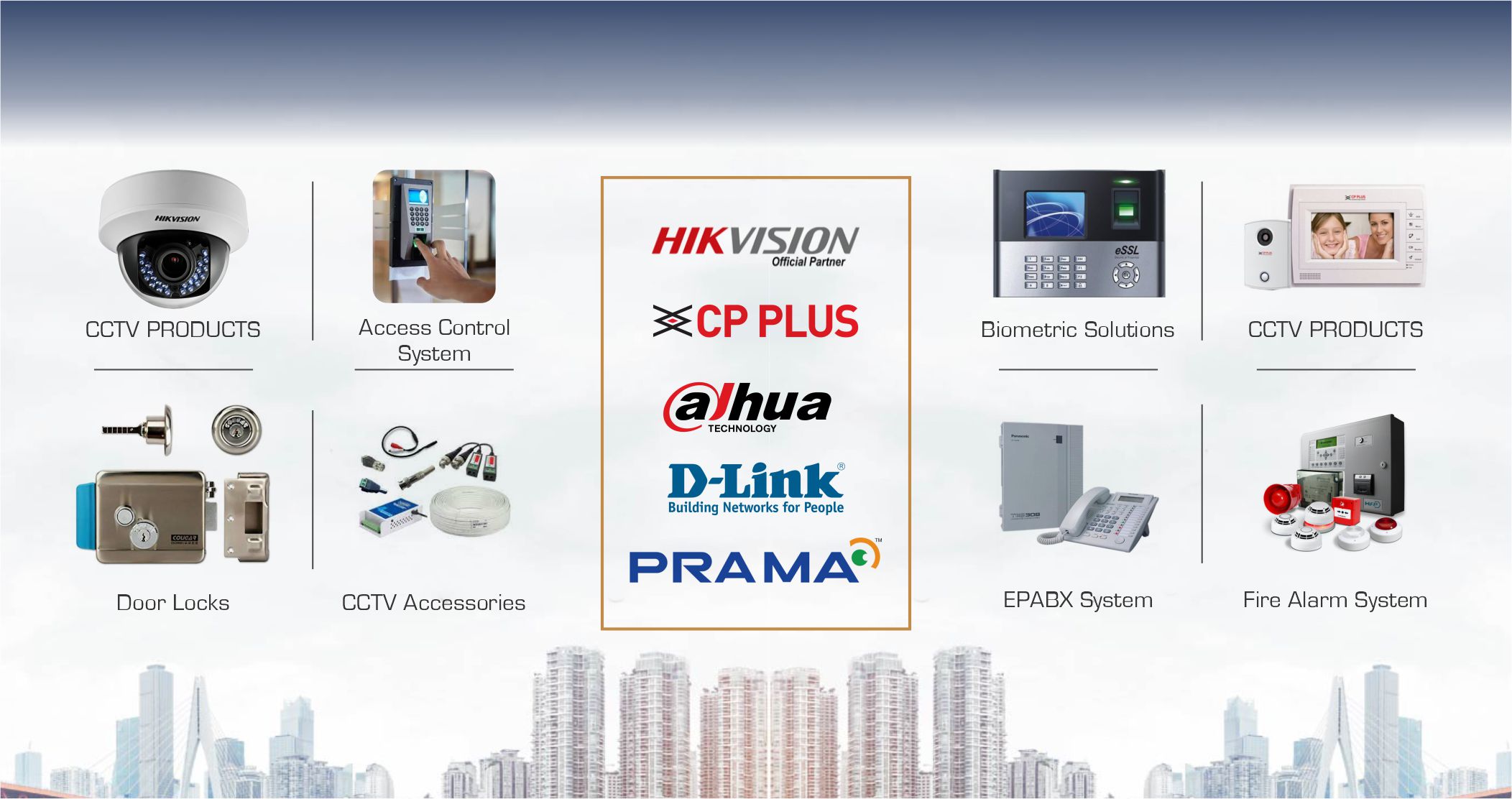 Our extensive product line-up encompasses Network Cameras, Network Video Recorders (NVRs), Dome Cameras, Bullet Cameras, Digital Video Recorders (DVRs), Speed Domes (PTZ Cameras), Video Door Phones, Biometric Attendance & Access Control Devices, POE Switches, Cat 6 Cables, 3+1 Coaxial Pure Copper CCTV Camera Cables, BNC & DC Connectors, Power Supplies, and more.